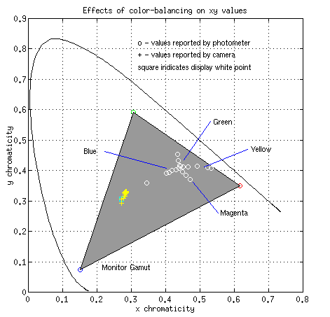Although it is fairly obvious from our test images that the camera is adjusting the color components of its images to compensate for lighting differences, I want to present that data in a quantitative format that would make this relationship clearer. On a chromaticity diagram, I plot the x,y values of Macbeth color checker white patch under various illumination conditions, the x,y values of the same patch as it appears on the display, the gamut of the display, and the display's white point. To simulate different lighting conditions, we placed blue, amber, green and magenta filters in front of a halogen light source. This explains the cross-like distribution of the white patches' x,y values. For the details of this experiment, please refer to my fellow group members' report.