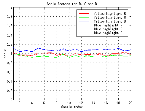 Overall, the camera's color-balancing works very well for this image. If we examine the plot of the red and green scale factors for the 20 'yellowed' squares in the image, we see that they are significantly below the 1.3 level to which they were originally raised.