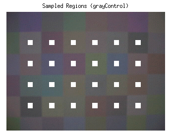 Now that we have taken the six crucial test images to determine the color-balancing characteristics of the D-220L, we need to gather color data from those images as efficiently as possible. To that end, I developed gatherAllData.m, which basically calls correctGamma.m on each image before running them through processLabData.m, which samples each RGB image for useful information. As mentioned previously in the Methods section of this report, we consider only the central 4x6 color squares of each image. processLabData.m goes into the middle of each square and grabs a region of pixels. It averages all the information in that window to derive a triplet of RGB values representative of that colored square. The white patches in the screenshot below indicate the regions from which we averaged over.