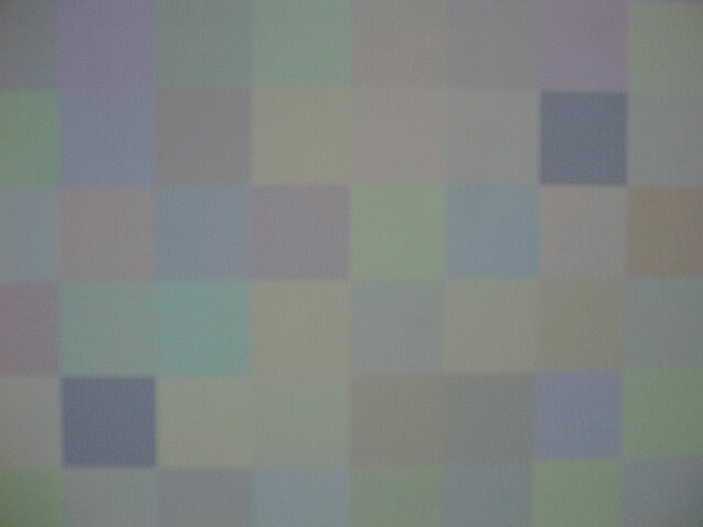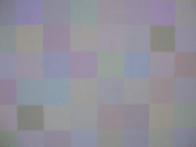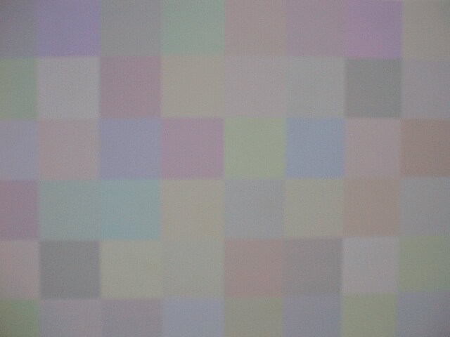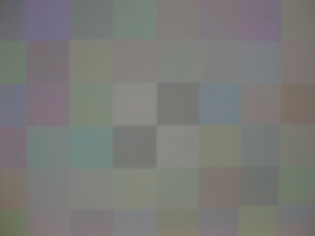 We generate our test patterns using two matlab scripts (makegray44.m, testpattern.m) which I wrote specifically for this purpose. Each test pattern consists of a 6x8 grid of 48 colored squares. We use makegray44.m to produce 44 colors which average out to a user-specified gray value; testpattern.m then takes in these colors along with a control patch color (it automatically generates a complementary control patch to maintain the overall gray average) and the layout of the control patches, and generates an image similar to the one shown in the figure below. Although we make sure that all 48 patches appear in every picture we take, my matlab scripts that analyze the image data consider only the middle 24 patches. This is to avoid errors and unreliable data due to image distortion along the edges.