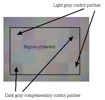 Our first test pattern consists of a grid with four gray control patches placed at the corners of the actual sampled region. These four patches will remain unchanged throughout the experiment. Because the camera uses a center-weighted light metering system (as stated in the user's manual), we want to locate our control patches such that they have a minimal effect on the camera's color-balancing circuitry. Both the user-specified control patch and its complementary patch appear twice in the test pattern to improve experimental accuracy. As you can see in figure 1, we picked a light gray color for our control patch.