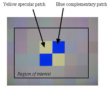The first test pattern consisting of a gray specular patch is used as a control. The second test pattern (see figure 2) has a bright yellowish patch (250, 250, 120), whereas the third test pattern has bright bluish patch (120, 120, 250). The overall gray level in all three images in 120. If the camera does indeed rely on the perfect reflector assumption, we would expect it to scale the bright patches towards white, causing the average of the surrounding patches to deviate from gray in the process.