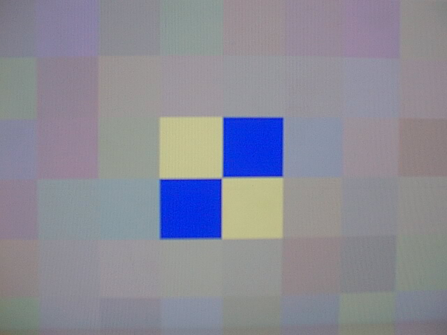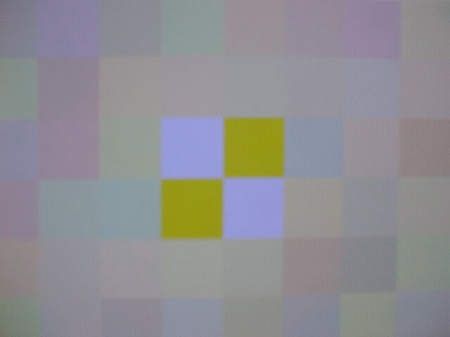 Our second test image is almost identical to the first, except that we multiply the red and green components of the 44 patches surrounding our four control patches by a factor of 1.3. This puts a yellow cast on the image, similar to the effect of tungsten lighting. If the camera attempts to correct this image according to the gray world assumption, it should scale the blue component of our four control patches such that it is 1.3 times higher that their red and green components.