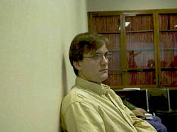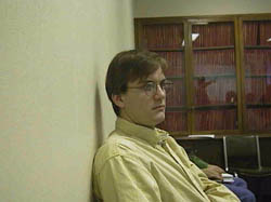 Once again, the gray world assumption fares poorly because of the lack of blue in the subject. As a result, it forces the subject to take on an unnatural blue cast. The perfect reflector seems to have little effect on the image because the brightest region, which is the reflection of the fluorescent lighting on the glass, is practically saturated out at white. The hybrid scheme, in my opinion, gives the best results in this case. The yellow cast is gone, and the wall now appears white. However, in removing the yellow from the image, the algorithm has the awful side effect of desaturating the yellow from the subject's shirt as well.