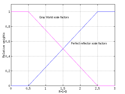 The hybrid color-balancing scheme suffers from the same problem as the gray world assumption algorithm of trying to boost non-existent blue shades in the original image. However, the mixing with the perfect reflector scale factors makes the effect less severe.