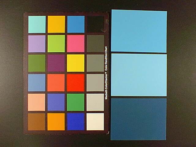 Initial attempts to photograph single color swatches with the Olympus camera ran in to some difficulties. It appeared in both the preview mode, and through some sample pictures that the image colors were being adjusted based on the overall colors in the field of view. While moving the samples around had no effect on this, adding one more color was sufficient to drastically change the appearance of the original swatch. It appeared that the camera was balancing the colors by averaging across the scene.