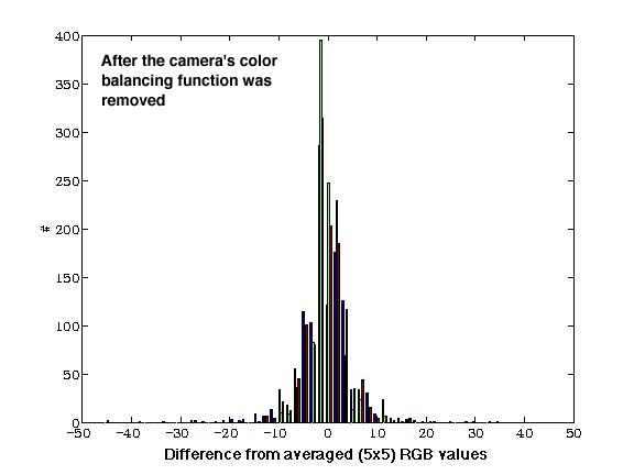 We were then capable of measuring the RGB values of the Macbeth Color Checker in the same manner as the color swatch measurements in every photo. The values for each square of the Macbeth were averaged over all the digital images taken. This averaged Macbeth chart was used as a benchmark to which each individual photo was compared. Using our assumption about the camera's need to balance over the entire field of vision, we were able to "unbalance" the images. In the following graphs one can see the difference that color balancing made. The graphs show the distribution of the samples showing errors, errors being the deviation of RGB values from the benchmark.