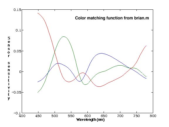 At this point, the SPD data from the radiometer had been adjusted for the tungsten light, and the RGB output from the camera had been "unbalanced" and had the gamma correction nonlinearity removed. We knew that the formula for calculating the RGB output from the SPD's was as follows.