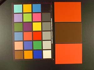 The original experimental design specified taking the digital camera pictures of swatches in a manner identical to the radiometer readings. However, it soon became clear that the Olympus camera was employing some color-balancing function that changed based on the color of the single swatch in the image area. Thus, we chose to include the MacBeth color checker alongside the color swatches to try and standardize the color balancing.