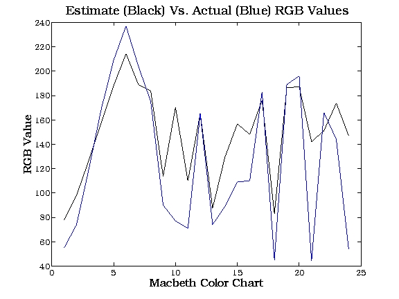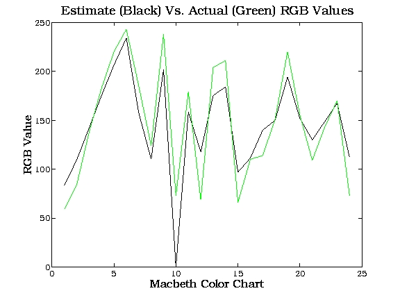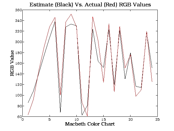 The full Macbeth checker was then pictured, to prevent color balancing effect, and the values of the colors were all obtained from this image. The match between measured and predicted was thus much closer as shown below: