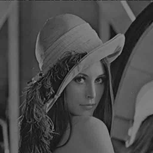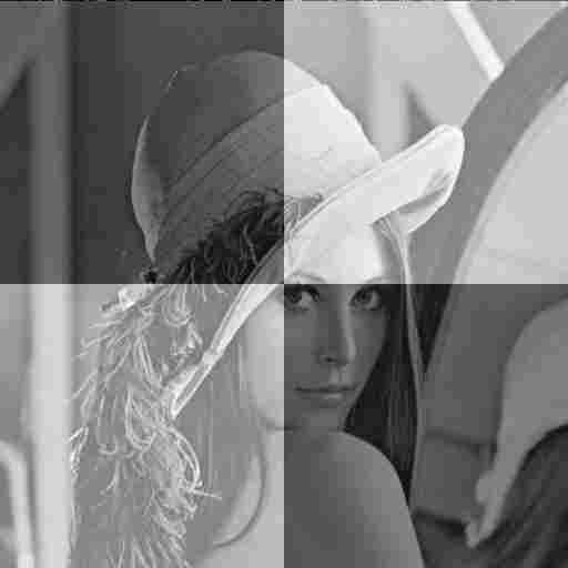 Each of these images have the same amplitudes but with different mean, the lowest on the left. As can be seen, the pattern is more noticeable towards the left. When the average brightness is higher, the same amount of regional change amounts to a lower contrast as compared to a lower average brightness. Thus the same variation in a bright region would be less visible than in a darker region. It works out in this algorithm thus. For a region with higher luminance, quantization of, say, value 223 to 200 would be less noticeable that quantization of value 123 to 100, even though the quantization error in both are the same, 23. Therefore, a larger amount of quantization will be possible in brighter regions, without loss of significant data. One thing about the DCTune program is that it provides a measurement of the quality of the compressed image which is different from the measurement that standard JPEG compression uses. Thus it is impossible to compress an image, using the two different programs, to the same quality and then compare which performed greater compression, since there is no concept of same quality between the two. Thus what I did was to used the two programs to compress in two different ways into the same size files before comparing their quality. A compressed image with better quality would have had better compression with same quality. The image I used for testing is based on the popular Lena image. What I did was to make two quarters of the image brighter than the other two. I had to scale the original image first though to ensure that when I increased the luminance at those regions, the image values do not get out of bound. Here is the link to the original pgm file.