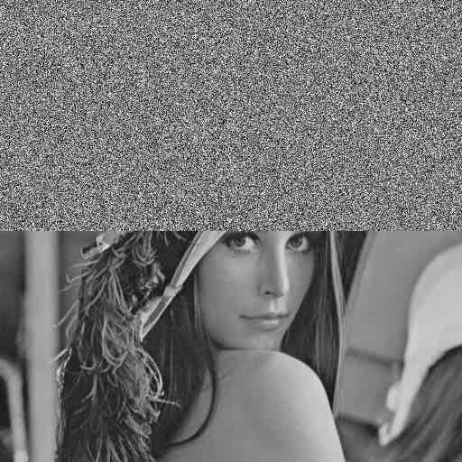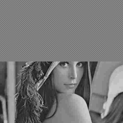 Looking at the two images, it is obvious that the DCTune compressed one is of better quality, ignoring the pattern at the top. The square blocks one the face and shoulder of the woman are less obvious in the second compared to the first. Also, there is a better representation of the hair at certain places. Moreover, the background is also more natural. All in all, it is possible to discern the greater number of gray levels in the second one, ie more bit representation, despite the two images having the same sizes. The saving must have come from having less bit representation, or greater quantization, in the regular pattern at the top of each image. However, there is hardly any difference in the visual quality of the pattern between the two so effectively nothing is lost. To further illustrate this point, I made a second similar image except that this time, the regular pattern was replaced with random white noise. Thus there will be no correlation between local image components at all. Then, DCTune would not be able to take advantage of this contrast masking. Follow this link for the original pgm image.