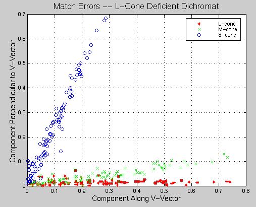 We would expect the dichromat to score around 50% on the L-Cone test, and higher on the others. Note that the dichromat score is quite low on the M-Cone test as well. This is not surprising, since the directions VL and VM are quite similar, or, equivalently, the L- and M-cone sensitivity profiles are similar.