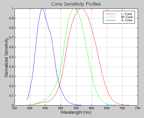 Similarly, the spectral sensitivity of any sensor is a function of wavelength. The spectral sensitivities of the L-, M-, and S-cones are shown in Figure 2. The amount, q, that a light stimulates a cone is the sum of the cone sensitivity multiplied by the spectral power of the light at each wavelength:
