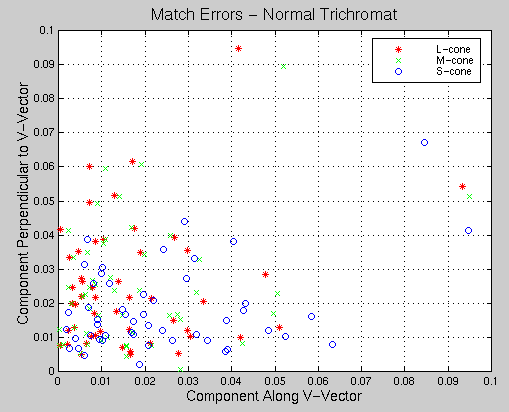 Figure 4 shows the polar plot of the error vectors for the matches performed by the trichromat. Notice that the angles of the errors are relatively randomly distributed, and the error magnitudes are relatively small.