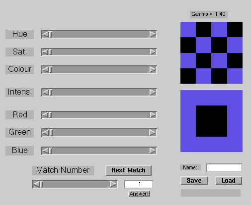 A colour matching graphical-user-interface (GUI) was designed using Matlab 5.0. The GUI displays a reference colour and the attempt to match as shown in Figure 3. The subject can vary the red, green and blue colour levels in order to create a match.
