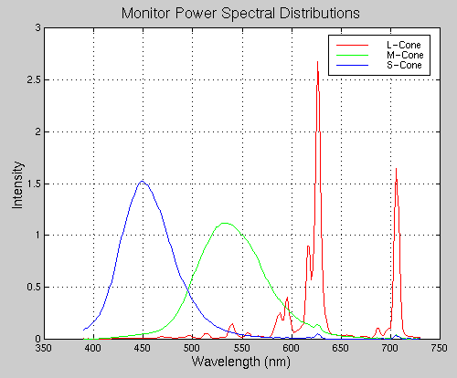 Any light can be broken into a spectral power distribution, which gives the amount of power at each wavelength. As an example, spectral power distribution of the light emitted from each of the red, green and blue guns of a standard computer display is shown in Figure 1.