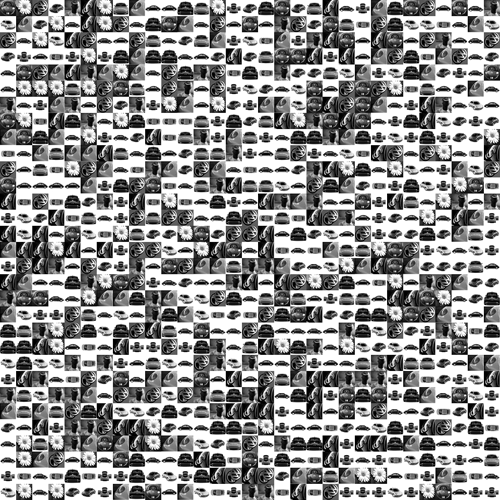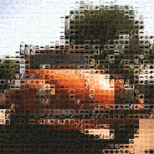Note that since the tiles have been chosen at random, there is no pattern or semblance of the base image yet. Step four: Blend the original image with the mosaic templateIn this step, the algorithm iterates over the base image, and analyzes each tile-sized region of the image, gathering 2 characteristics of each region:1) Mean R, G, and B values 2) Singular Value Decomposition Using these values, each tile of the template is transformed into the new color indices as generated from the corresponding region of the original image.