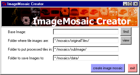 Note: Wandell's algorithm contains another step, in which a spline operation is performed over the tiles in the image. I have omitted this step for the time being. ImplementationBeing familiar with the scripting language Tcl, and a newcomer to Matlab, I decided to take on the project of developing an implementation of this image mosaic creation process in Tcl.One of Tcl's selling points is that it comes bundled with the graphical toolkit Tk, which allows for the development of graphical interfaces which can interact with the rest of the scripted code. I am interested in interface design as well as vision, so I wanted to create something which would be easy for anyone to use in order to create an image mosaic. Here is a screen shot of the main window of the interface.