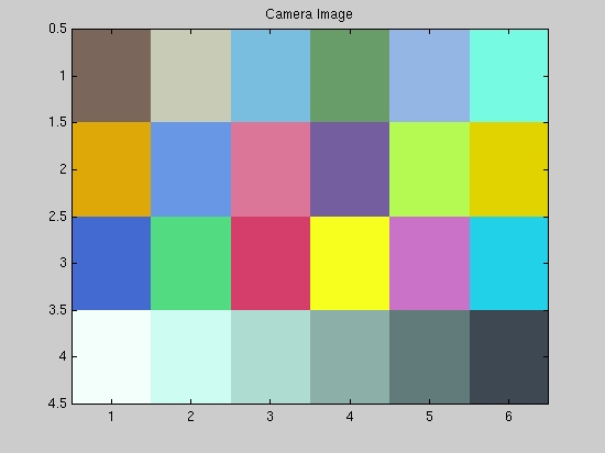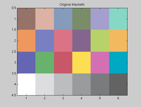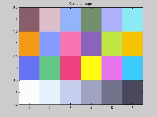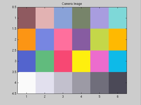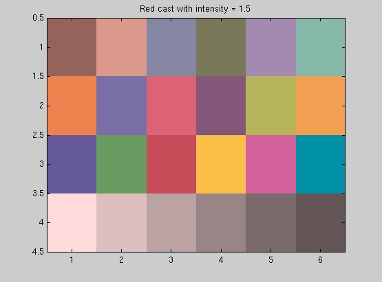 To investigate what the digital camera is doing, we photographed the color-casted images displayed on the monitor and saved the images as BMP files. Then, we sampled the images using the special function that we wrote for this purpose reindexImage.m and displayed the resulting image (after adjusting for the gamma of the camera ) to compare how the colors in the macbeth image are affected by the different casts and whether the camera adjusts the colors in case its sensors detecte specularities.