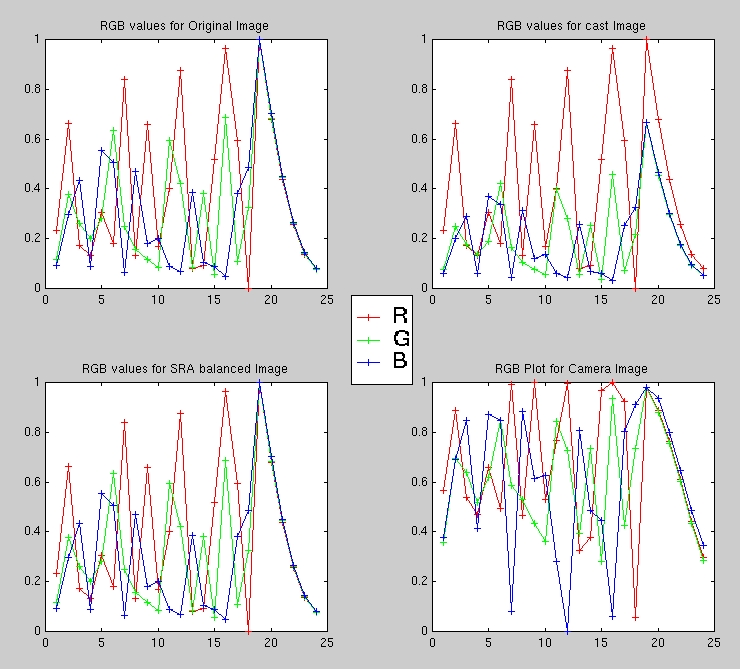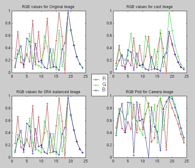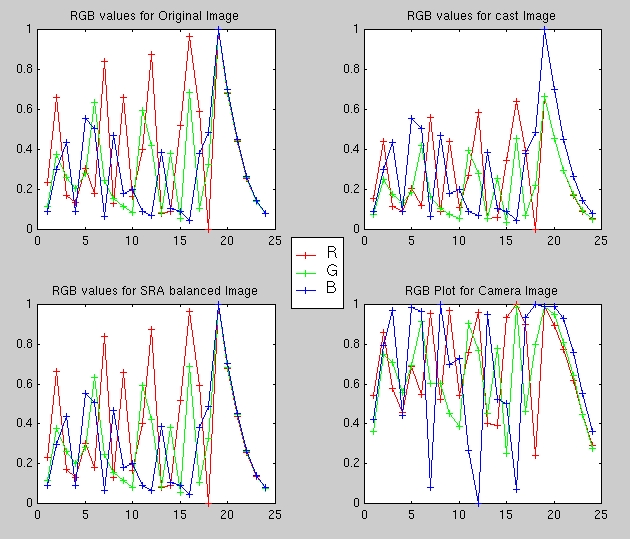 The RGB plots serve to illustrate how the camera amplifies the values of all three color channels as seen by comparing the RGB plots for the color-casted image and the camera image. On the other hand, our algorithm tries to compensate for the presence of the color-cast by raising the value of the "complementary" colors. For example, in the green-casted image, the SRA color-balanced RGB response tries to compensate by raising the values for the red and blue (i.e., magenta) to counter the green-cast to perform the color balancing. This is the essence of "dividing by the white point".