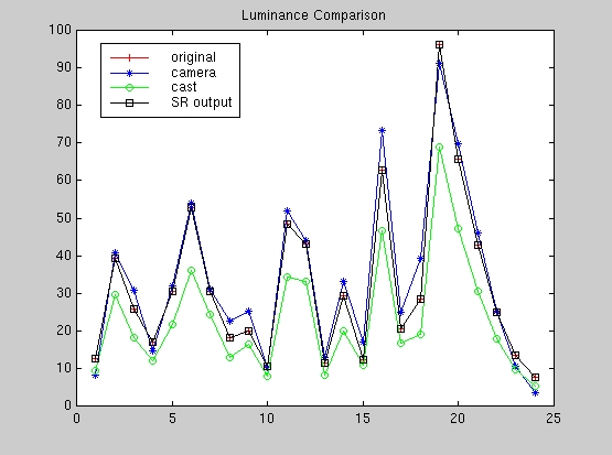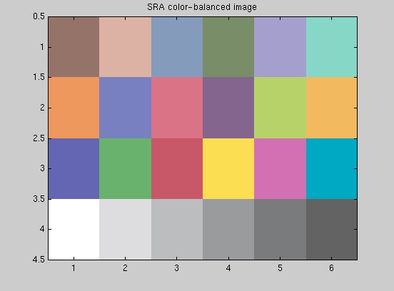The following matlab script SRADisplay.m was used to display the original macbeth colorchecker image, the macbeth color-casted image and the SRA color-balanced image (as in the above scripts) in addition to the sampled image from the camera. The script also plots the RGB values and the luminanace (Y-values) for the following: