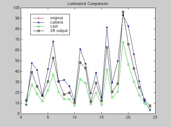 Looking at the luminance plots for the three experiments above confirms our suspicion that the camera does indeed detect the specularity present in the image (in all cases, surface number 19) as evident by the consistent high value for the camera luminance response at surface 19 which we constructed to be the white point of the image. As a result, the camera image appears to be adjusted to this white point as shown by the overall brightness of the camera image compared to the SRA color-balanced image. The difference in appearance between the camera image and our SRA color-balanced image is not the issue here since we mentioned in the beginning that the algorithm we are employing is rather simple and we presume that the camera is using a more sophisticated algorithm. However, even with our simple algorithm we managed to match the camera response especially for the red-casted image.