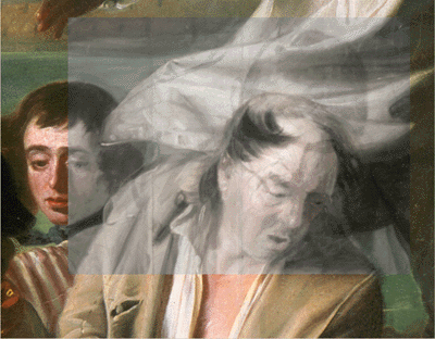 The VASARI system can be fitted with an X-ray or Infra-red scanner. Combined with visible images, these can be used for greater analysis of the paintings. In addition, because of the high wavelength of infra-red light, top levels of paint are transparent. This can reveal charcoal sketches that the artist made before painting, and offers researchers more information for their studies of the paintings on the artists original intentions, any restoration attempts, and any modifications to the painting made by subsequent artist. (An example is loincloths that were often painted over nude figures.) The picture below is an infrared scan on top of a visual scan to show an additional figure in the original sketch. A younger man was originally painted by the artist in place of the man on the right.