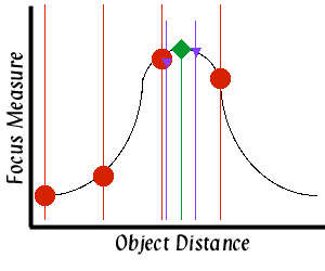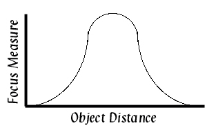 Instead, we adopted a method informally known as "staying on top of the mountain." We start the camera with a certain object distance and acquire an image and calculate the focus measure. We move the camera forward a certain object distance increment and re-acquire the image and focus measure. If the second measure exceeded the first, we continue in the same direction with the same increment. If the first measure were greater than the second, we reverse the direction and halve the increment. We repeat the process until the differences in the focus measures between two consecutive images is less than an user-specified threshold.