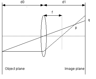 In this figure, f is the focal length, d0 is the distance between the object plane and the lens, and d1 is the distance between the lens and the image plane. Variations in any of the above three parameters, f,d0 and d1, will result in changing the focus.