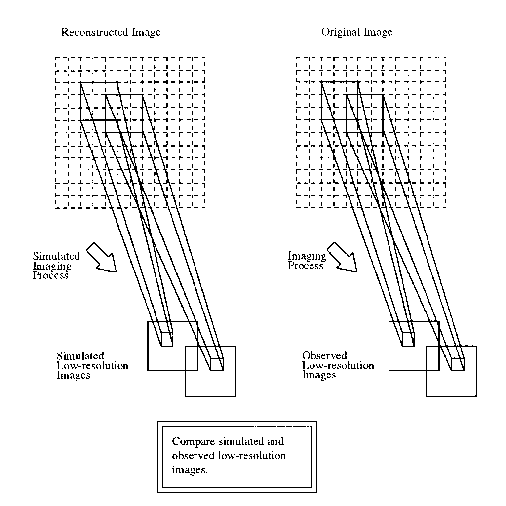Simply increasing the number of pixels, interpolating and averaging over multiple frames, often improves the quality and is typically used as a starting point. To go beyond that, knowledge of the imaging process and the viewing geometry is necessary. The further, to simulate the imaging process and the latter to match the various frames accordingly. If the camera or sensor geometry (viewing position, angle, distortion etc.) is known, then the geometric transformations can be directly incorporated in the imaging and reconstruction process. If the geometry is not known , i.e. multiple overlapping frames of unknown origin, then the images have to be registered. More on Image Registration here.