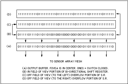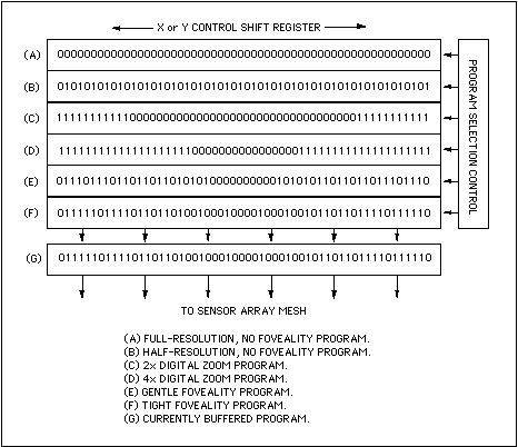 While the foveal profile can be changed by up-loading different contents into the row and column shift registers, the peripheral X-Y control can also include a capability for multiple programs that can be instantly switched. This is accomplished by designing the shift registers to be more than one bit deep and switching between different levels in the register, which can be accomplished instantaneously. Programs might include:
