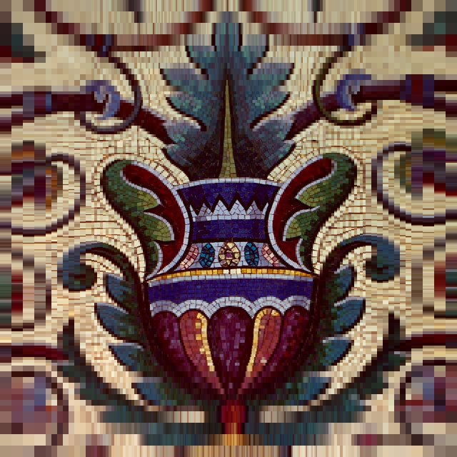 In the following examples, the foveation parameters given in table 1 were tweeked to provide a slightly more dramatic foveation effect than actually expected at the viewing distances given below. This is to more easily show higher level of foveation given the small image sizes used. For a test image, a color photograph of a mosaic found on Stanford's Memorial Church was shot by this author and scanned at 24 bit color depth (8 bits each of red, green and blue), and a size of 640 by 640 color pixels. The picture is therefore described in 1,228,800 bytes with no compression used. It is shown here in full resolution: