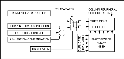 If one is to perform foveal imaging on the focal-plane array, one needs to be sensitive to the kinds of computations that can be implemented in compact and fast VLSI. Compactness, in particular, is important, since in CMOS imagers, the sensitive imaging area is compromised by the inclusion of additional circuitry. Other criteria that tend to make VLSI systems practical in a conventional sense include the use of manhattan (x-y) geometry rather than organic (i.e., circular) geometry, and peripherally addressed control vs. pixel independence (address-event architecture). Naievely, an address-event architecture [XXX] appears well-suited to vision applications, as it resembles the operation of the human eye in many respects. Likewise, implementing circuiar foveal sensors [XXX] also appears to be directly applicable. However, neither of these are well suited to electronically adapting the foveal focus. A circular foveal sensor would need to be mechanically aimed in order to focus the foveal center at different points in the field of view. Likewise, the address-event scheme has no intrinsic way of coordinating a region of pixels to act as a foveal center, as all pixels are, by definition, acting independently.