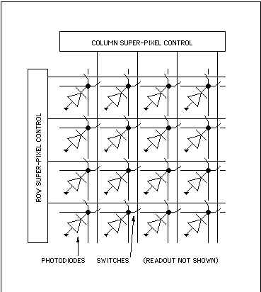 Two switches per sensor diode are needed. If every row and column switch is open, none of the diodes are connected, and the entire array operates at full resolution (4x4 in figure 8). If every other row and column switch is closed, then 2x2 super-pixels are created that average the light gathered among 4 pixels at a time, and the resolution of the array is reduced by a factor of two in both x and y (yeilding a 2x2 array seen in figure 8). Thus, the array can be configured for almost any resolution.