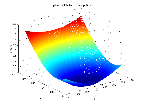 Next, this pyrlevel structure was used to generate a foveated image. In the literature, the most common approach to this is to use a floor operation to convert level numbers from the pyrlevel matrix into integers. An example using such an approach is shown in Figure 6. While this approach is computationally efficient, the ring artifacts around each step boundary are quite noticeable. Even when fixating on the correct point of gaze as calculated for the image, the ring artifacts are noticable in the peripheral vision. In order to reduce this effect, interpolation between pyramid levels is necessary.