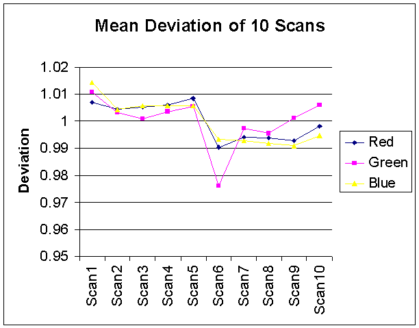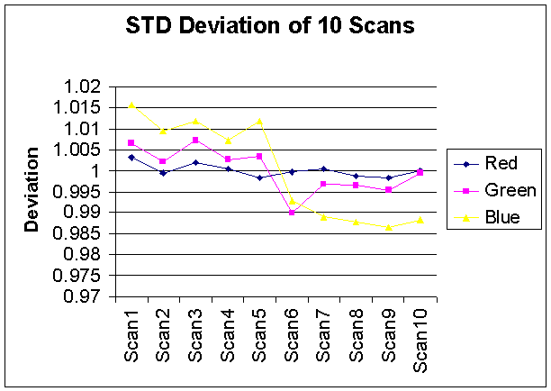 Before we implemented our analyses, we first needed to evaluate the reliability of the HP photo scanner and the random noise that is generated by the scanning processes. In order to evaluate these parameters, we scanned the same image ten times and computed the means and STD of these pictures. Our results showed that the data we collected only deviates by ± 0.5 %. Figure 2 and 3 show the deviation of the mean and STD of these ten scans.