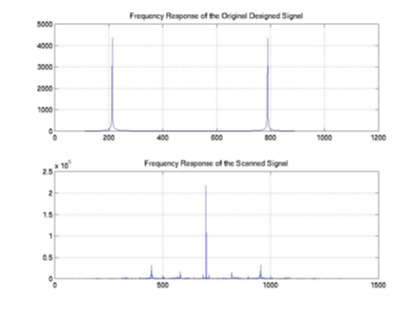 Our second step is to investigate the scanner’s capability to capture the high frequency response of the image. We created a sample image with alternating black and white lines by generating a sinusoidal signal of a constant carrier frequency. We then printed and scanned the image into the scanner to compare the captured signal with the one that we created. Figure 4 shows the black and white line pattern with 80 Hz central frequencies and Figure 5 shows the corresponding one-dimensional signal. In order to investigate the high frequency response of the scanner, we designed the same black and white pattern with 288 Hz carrier frequencies (Figure6 & 7). Our results showed that the scanner does a good job on capturing these high frequency signals. Furthermore, we also computed the one-dimensional Fast Fourier Transform for both the designed and captured signals (Figure 8). In the frequency domain, we can clearly observe the peaks at the corresponding carrier frequency. In other words, the noise that we observed in the captured signal is more likely due to the printing processing, but not to the scanning processing. As a result, based on both preliminary tests, we can certainly confirm that the scanner can produce reliable digital images and the random noise that is generated by the scanning processing is relative small comparing to the noise that we added to the images.