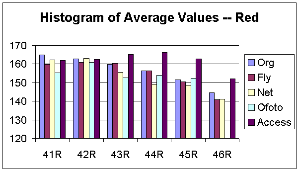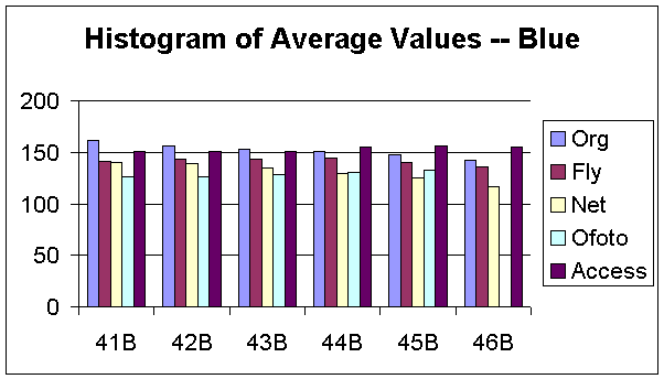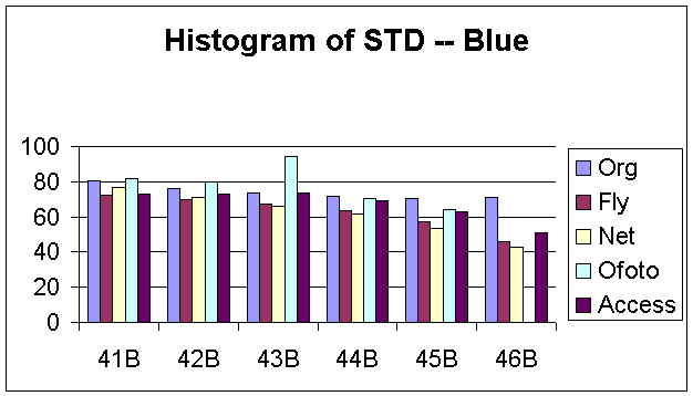 Figure 15, 16, 17, 18, and 19 are the distributions of noise average across the entire image for the B component. We certainly observed that the noises for the ShutterFly, Ofoto, and PhotoAccess images are not uniformly distributed across the image. Specifically, the processes of both PhotoAccess and Ofoto well eliminated noises in the upper corner of the images. The processes of ShutterFly actually added more noises in one region and eliminated too many noises in the other region. Additionally, the noise distributions of the images processed by PhotoNet matched perfectly with the original images.