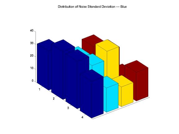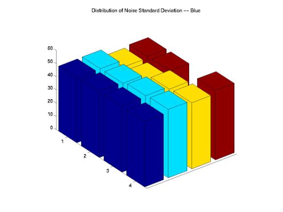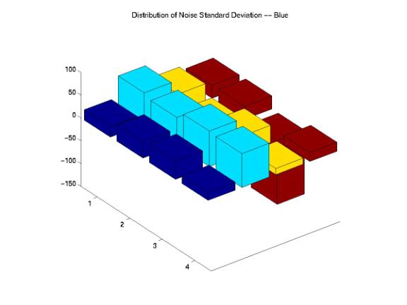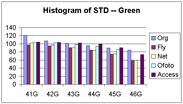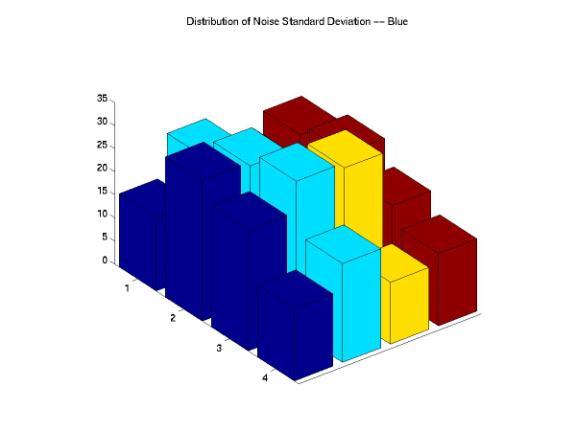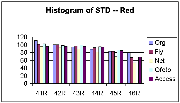 Figure 12, 13 and 14 show the histograms of the STD for each R, G, and B components. As expected, for the original images, the STDs decrease as the noise variances increase. We evaluated the noise reduction processing by studying how well could the images processed by these companies matched our designed images in term of means and STD. However, the percentages of mean and STDs decreases are relatively small for all images processed by each company. We certainly could not evaluate the noise reduction processes of these companies just based on the variations of means and STDs. Therefore, we needed to investigate the distributions of noise across the entire image by decomposing the images into a set of blocks.