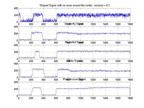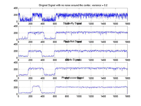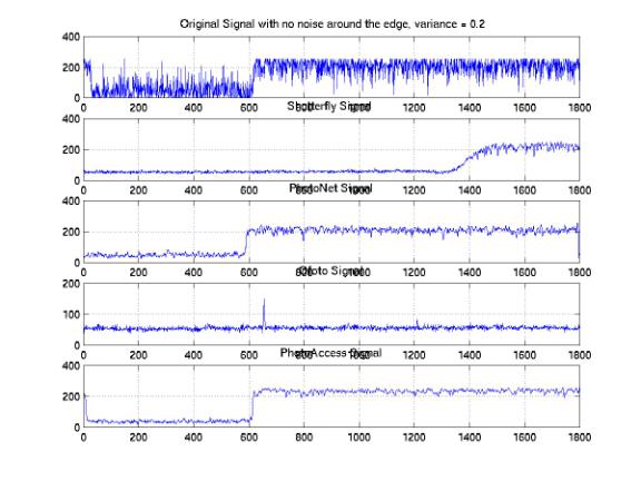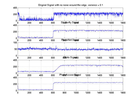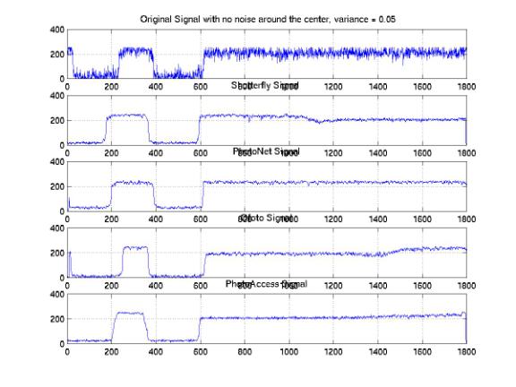 We analyzed the one-dimensional signals along the same horizontal line across the images processed by these companies. In order to investigate the distributions of the signals, we studied the sample signals along both the edge and the center of the images. Figure 25, 26, and 27 show the one-dimensional signals along the same horizontal line at the center with 0.05, 0.1, and 0.2 variances. We found a significant amount of noises that were eliminated at all noise levels. The PhotoAccess signals are relatively smoother than the signals for the other companies. Both of the edges of the ShutterFly and PhotoNet signals are blurred. As a result, the image features are either enlarged or shifted with respect to the original features. Furthermore, the signals along the edges of the images provide significant evidences to demonstrate the non-informality of the noise elimination processes (Figure 28, 29, and 30). We identified the improper rising or falling edges for both PhotoNet and Ofoto signals. These improper edges indicated that while we would not identify the shifting or blurring of the image features by the naked eyes, the features actually are not correlated with the designed images. Moreover, the PhotoNet signal with 0.1 variances is completely lost and the Ofoto signal with 0.2 variances is flat except an impulse around the location where the edge supposed to be.