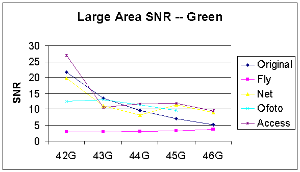 According to our computations, the Large Area SNR for the original designed images decreases as the noise level increases (Figure 34, 35, and 36). For all R, G, and B components, the Large Area SNR for the images processed by PhotoAccess is greater than the same images processed by other companies as the noise variances increase from 0.1 to 0.5. Although the Large Area SNR for the PhotoAccess image with 0.02 variances is less than the one for the corresponding original designed image, the noise reduction processing by PhotoAccess is much better than the other companies in general. On the other hand, the Large Area SNR for the images processed by ShutterFly is much lower in magnitude than the same set of images processed by other companies, even for the image with no noise. However, the ShutterFly Large Area SNR actually increases as noise level increases for both G and B components.