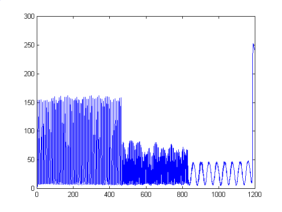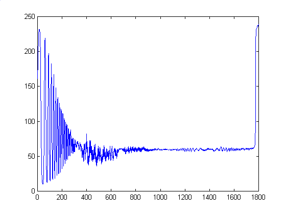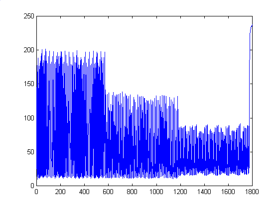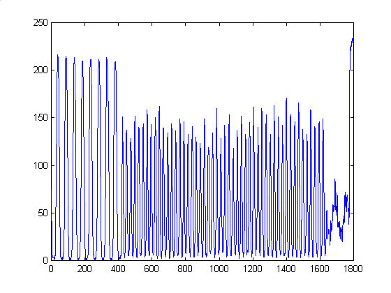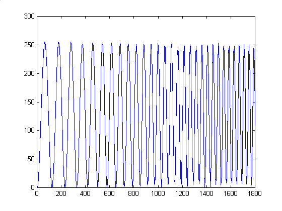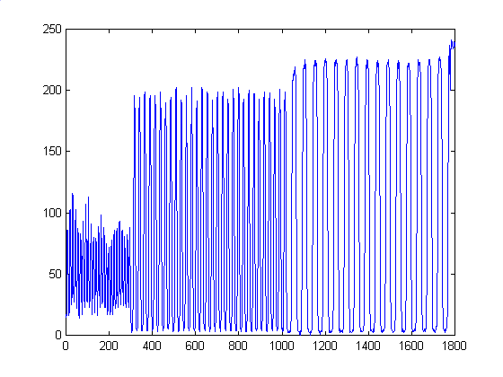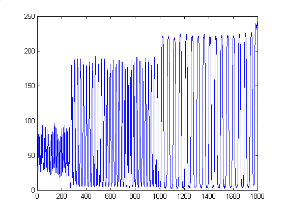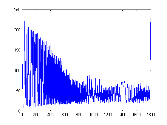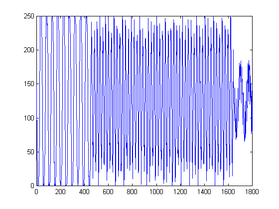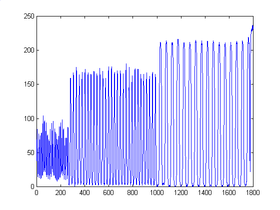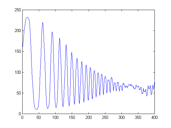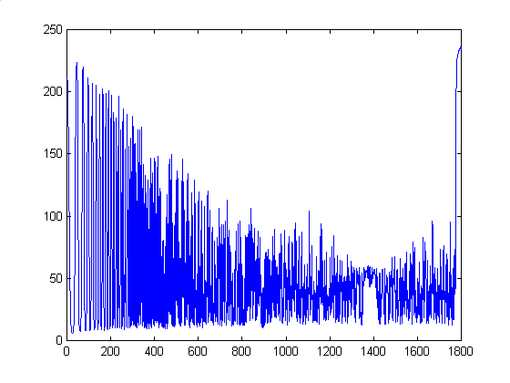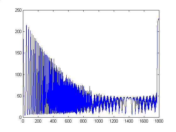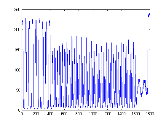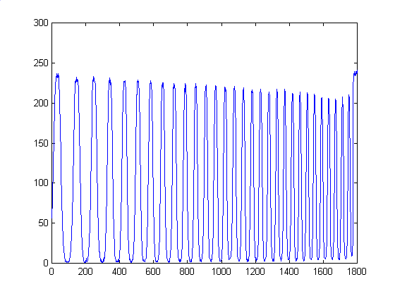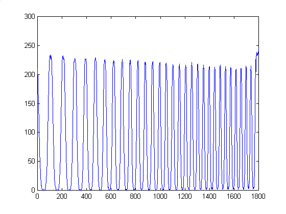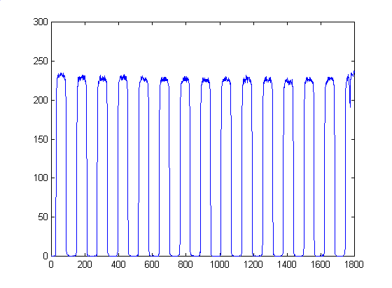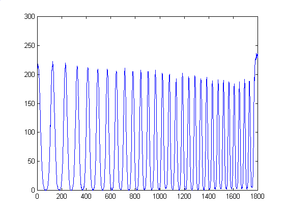 Horizontal Sin Pattern - We took each column of pixels across the 1800 pixel width, averaged the values, then plotted the average across the width. This helped to eliminate any stray errors that might come up, and helped to reduce some of the problems we had above.