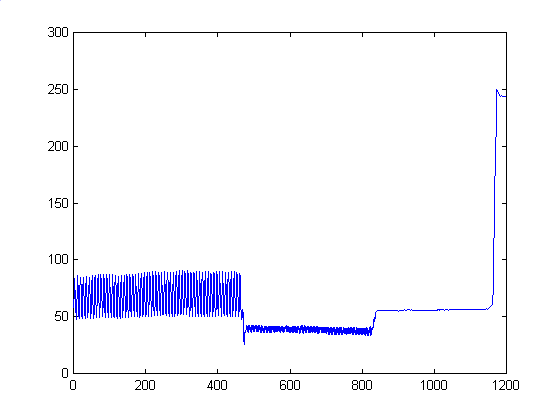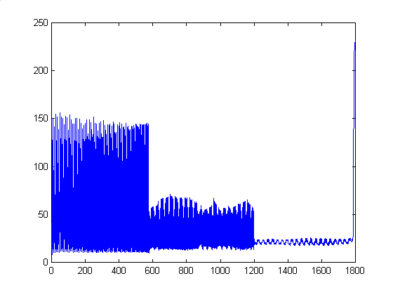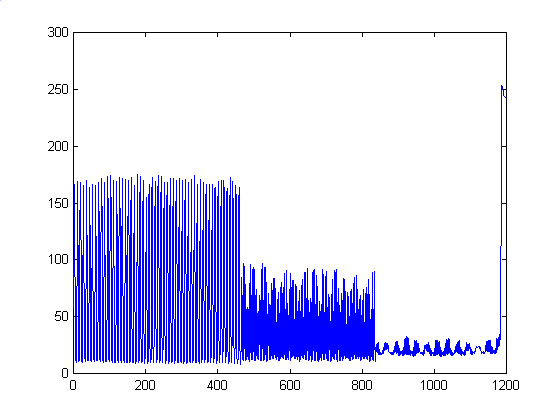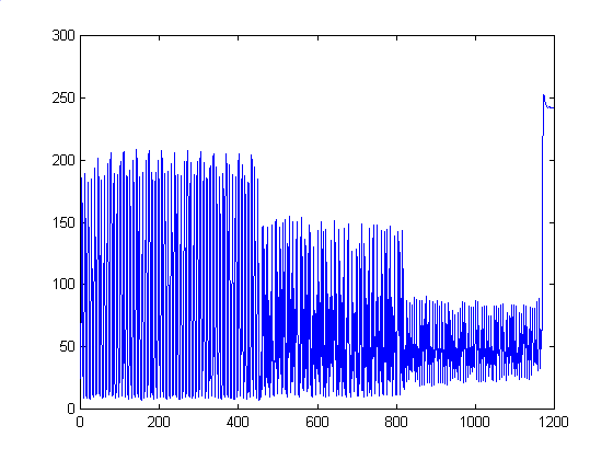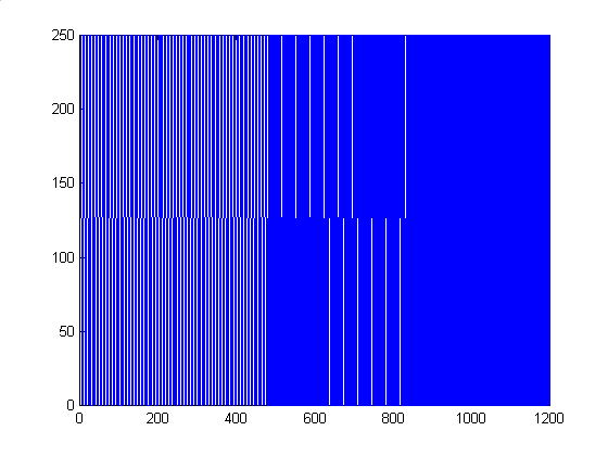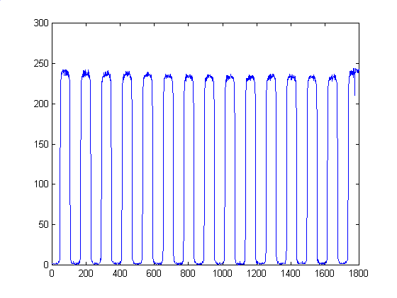 Vertical Rect Func Pattern - We traversed the rows this time, instead of the columns, and did the same averaging calculations we did for the horizontal sin and rect patterns. We plotted the results across the height of the image, this time (1200 pixels).