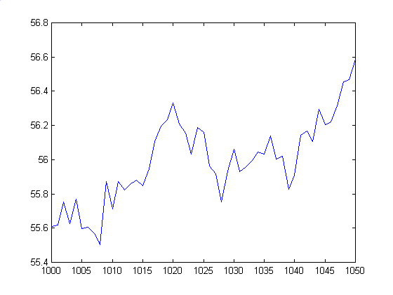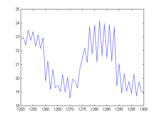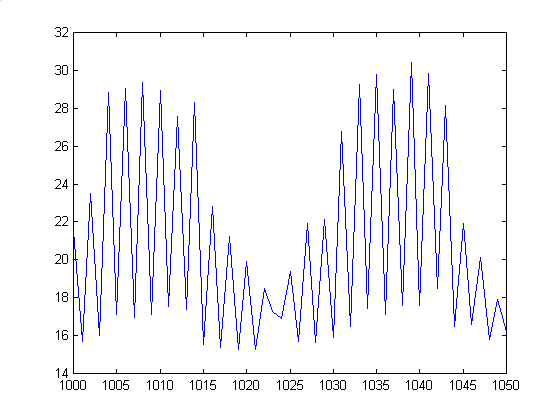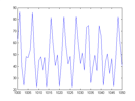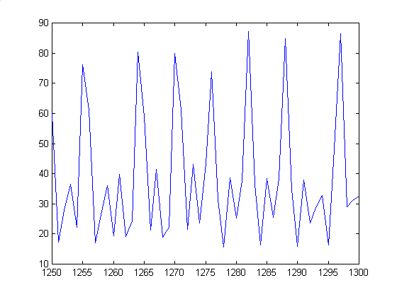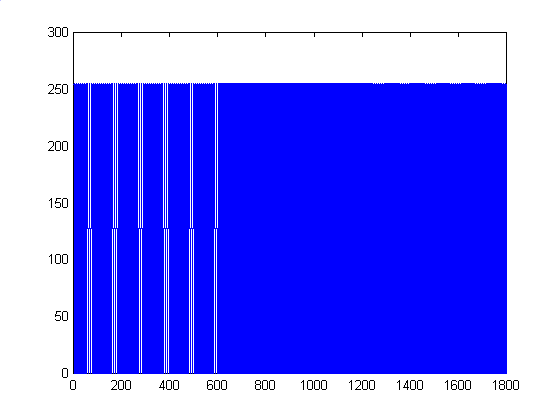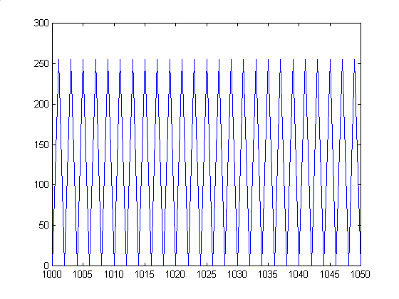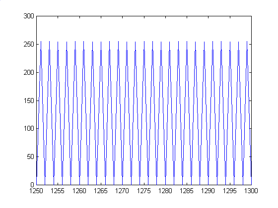 45 Degree Vertical Rect Pattern - We used the same code as for the 45 Degree Horizontal Rect Function Pattern, taking a cross section of the image at row 500, which was arbitrarily chosen.