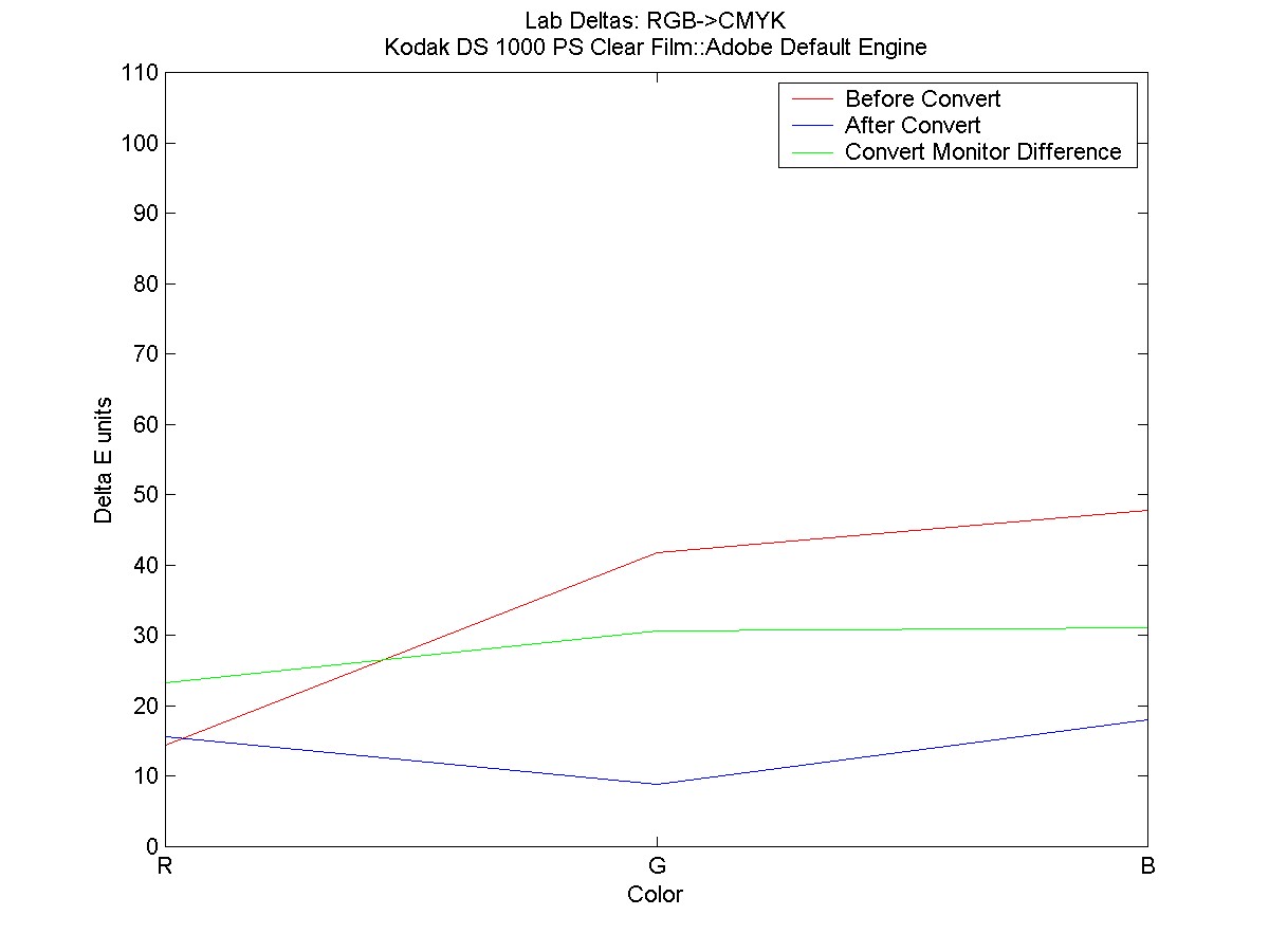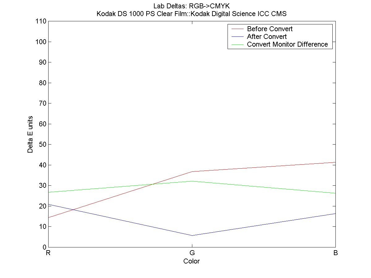 The Green plot shows the difference between monitor color values before and after color conversion.