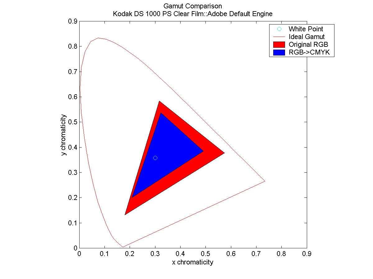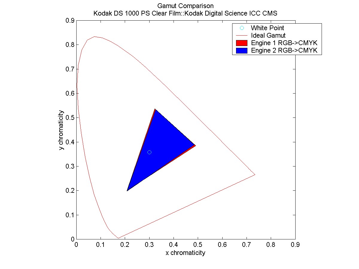 The first two plots depict the RGB gamuts measured on the computer monitor before and after calling the function, 'Convert to CMYK' for both Engines.