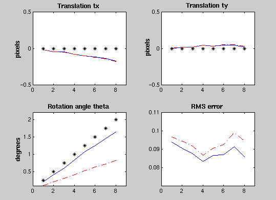 Algorithm performance on small rotations applied to the shape phantom (theta<=2 degrees). The