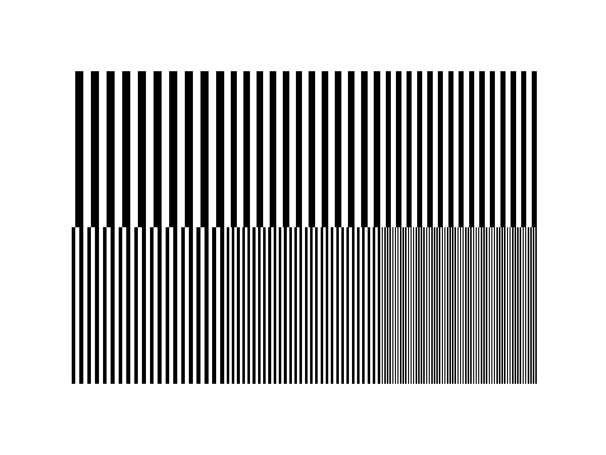 Each line bar target group in Figure 1 has only one single frequency; however, the lower three groups may seem to have more than one frequency. This is because the maximum spatial resolution of the monitor is lower than the spatial frequency of the line group represented. This is also known as aliasing. MTF limitation by the system spatial resolution will be explained in the following section.