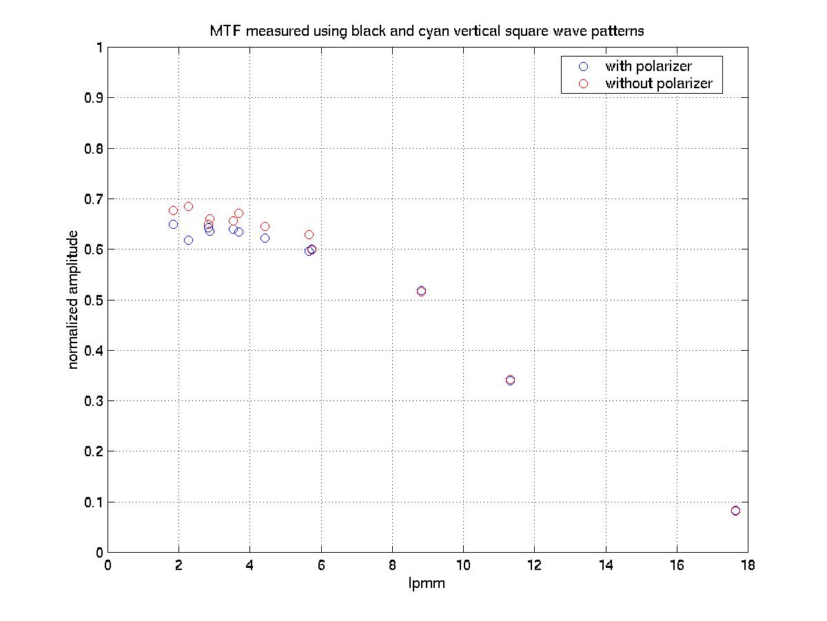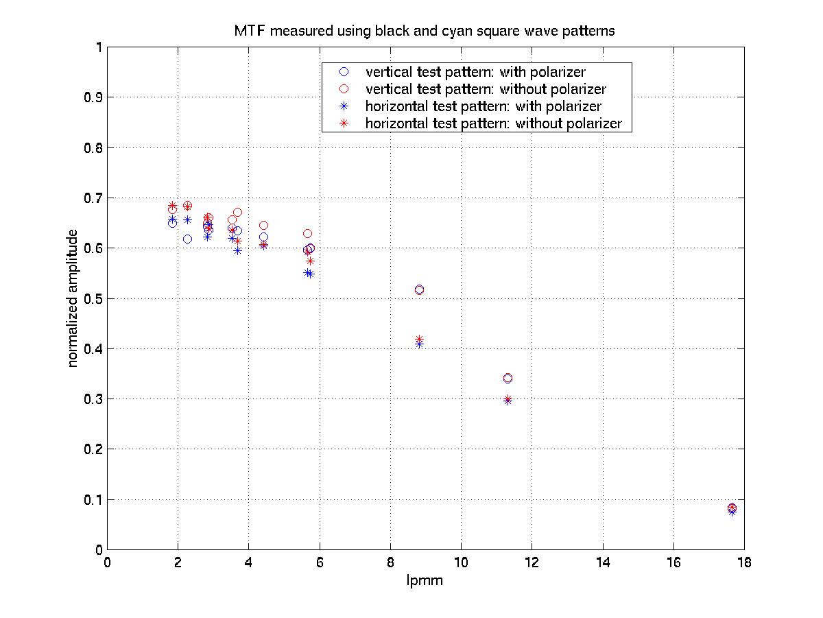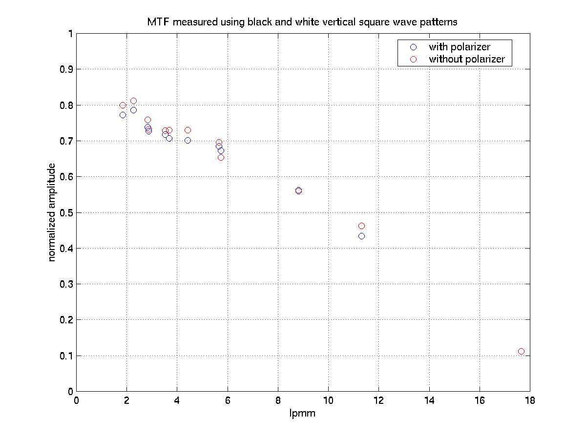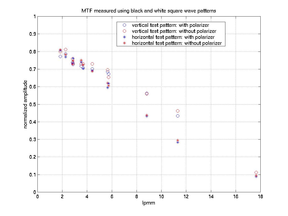 All test patterns are captured with the Ricoh camera twice: once with the polarizer and once without. For each output image, the relative contrast of the imaged square wave is measured and the results are plotted in Figure 2 , Figure 3 , Figure 4 , and Figure 5.